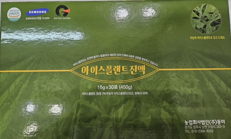 - HOME > 가공품 > 건강차/즙/환/분말 > [농업회사법인 동미] ★무농약★ 동미 아이스플랜트 진액(450g)