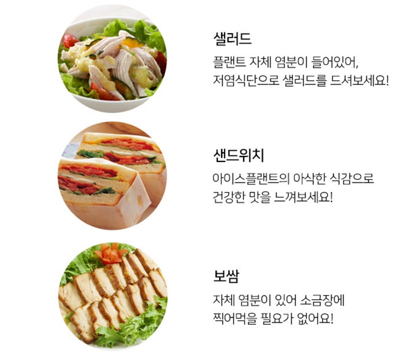 주의사항: 아이스플랜트 표면에는 미네랄이 풍부하여 흐르는 물에 가볍게 씻어서 섭취해야합니다.